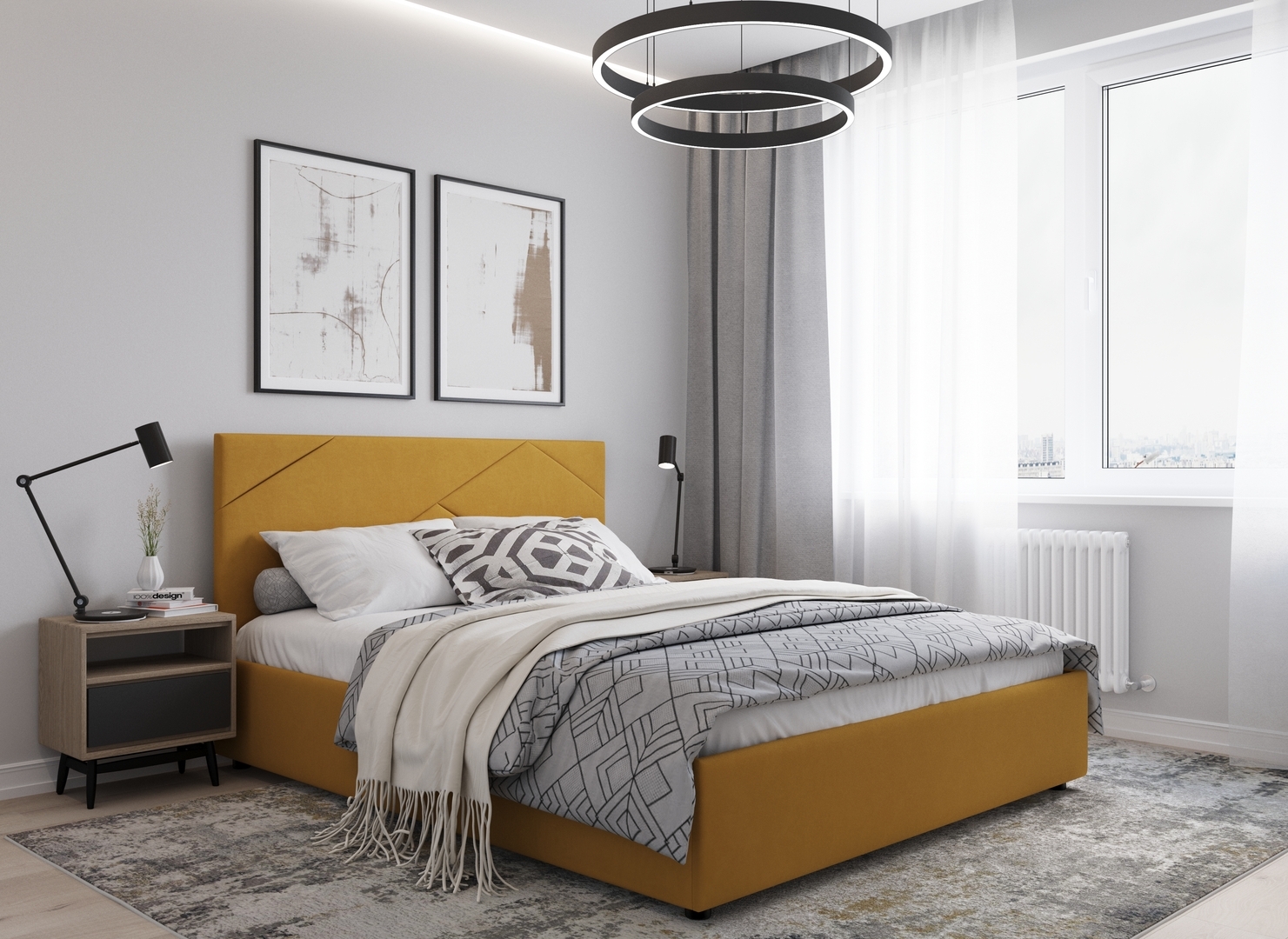 MOON FAMILY 1257 привлекает внимание оригинальным исполнением: широкие полосы ткани эффектно пересекают периметр изголовья, создавая на нем графический орнамент. Лаконичные формы объемных царг создают единый гармоничный образ и фокусируют внимание на центральном текстурном элементе кровати.