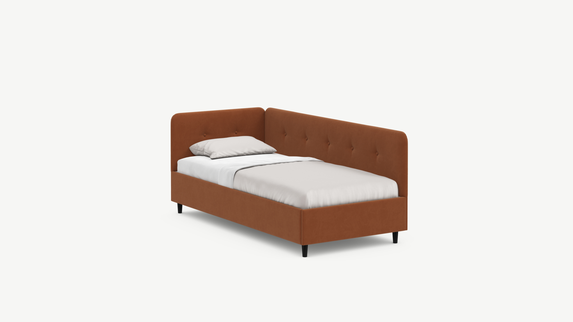 Кровать угловая с подъемным механизмомУгловая односпальная кровать MOON FAMILY 1253 с мягкой спинкой и изголовьем обладает округлыми формами, привносящими в интерьер нотки нежности. Изголовье, украшенное пуговицами, добавляет окружающему пространству шарм и уют. Высокие опоры придают кровати визуальной легкости, а также обеспечивают удобство во время уборки.
