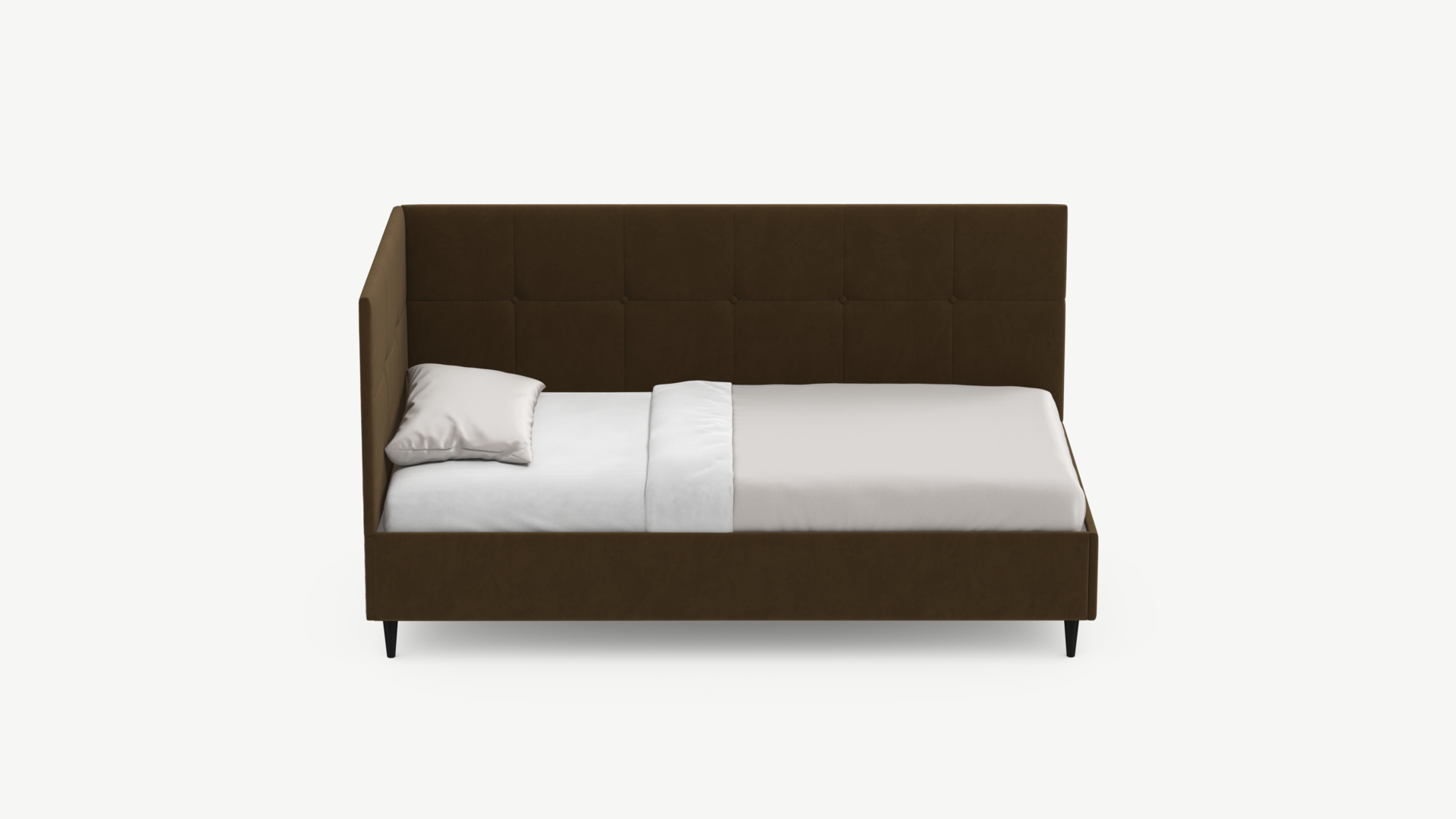 Угловая односпальная кровать MOON FAMILY 1261 с мягкой спинкой и изголовьем создаст в Вашей спальне ощущение уюта. Крупная квадратная стежка привносит в интерьер графических акцентов, а вставка из пуговиц наполняет пространство ощущением домашнего тепла.