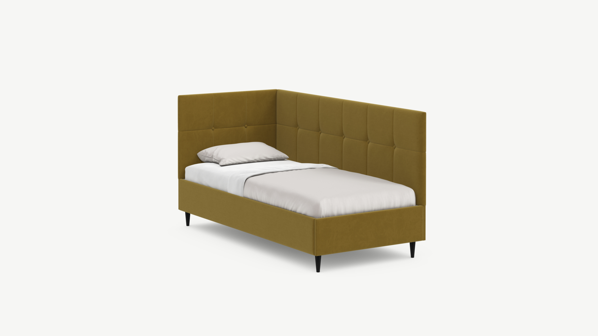 Угловая односпальная кровать MOON FAMILY 1261 с мягкой спинкой и изголовьем создаст в Вашей спальне ощущение уюта. Крупная квадратная стежка привносит в интерьер графических акцентов, а вставка из пуговиц наполняет пространство ощущением домашнего тепла.
