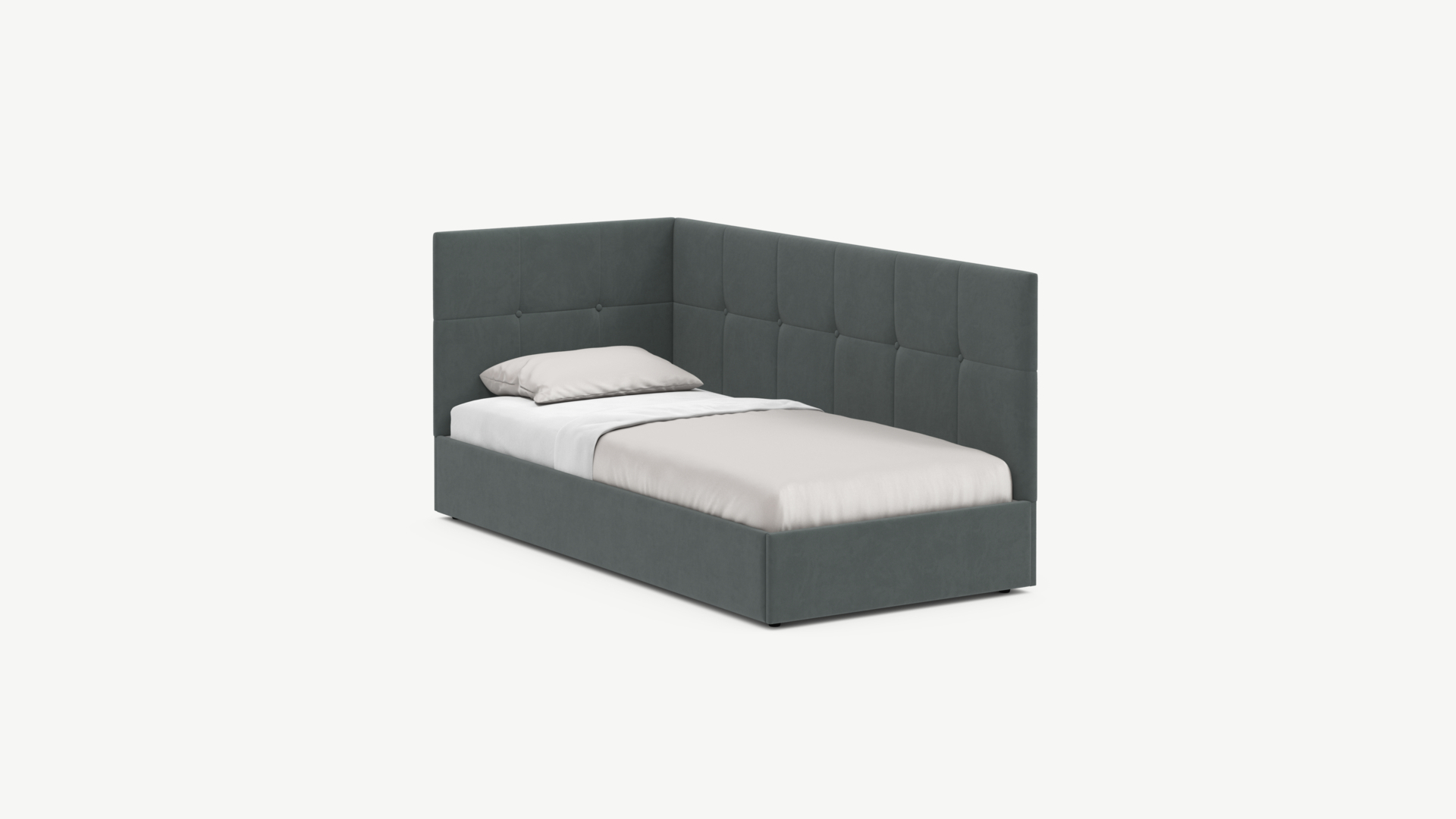 Угловая односпальная кровать MOON FAMILY 1261 с мягкой спинкой и изголовьем создаст в Вашей спальне ощущение уюта. Крупная квадратная стежка привносит в интерьер графических акцентов, а вставка из пуговиц наполняет пространство ощущением домашнего тепла.