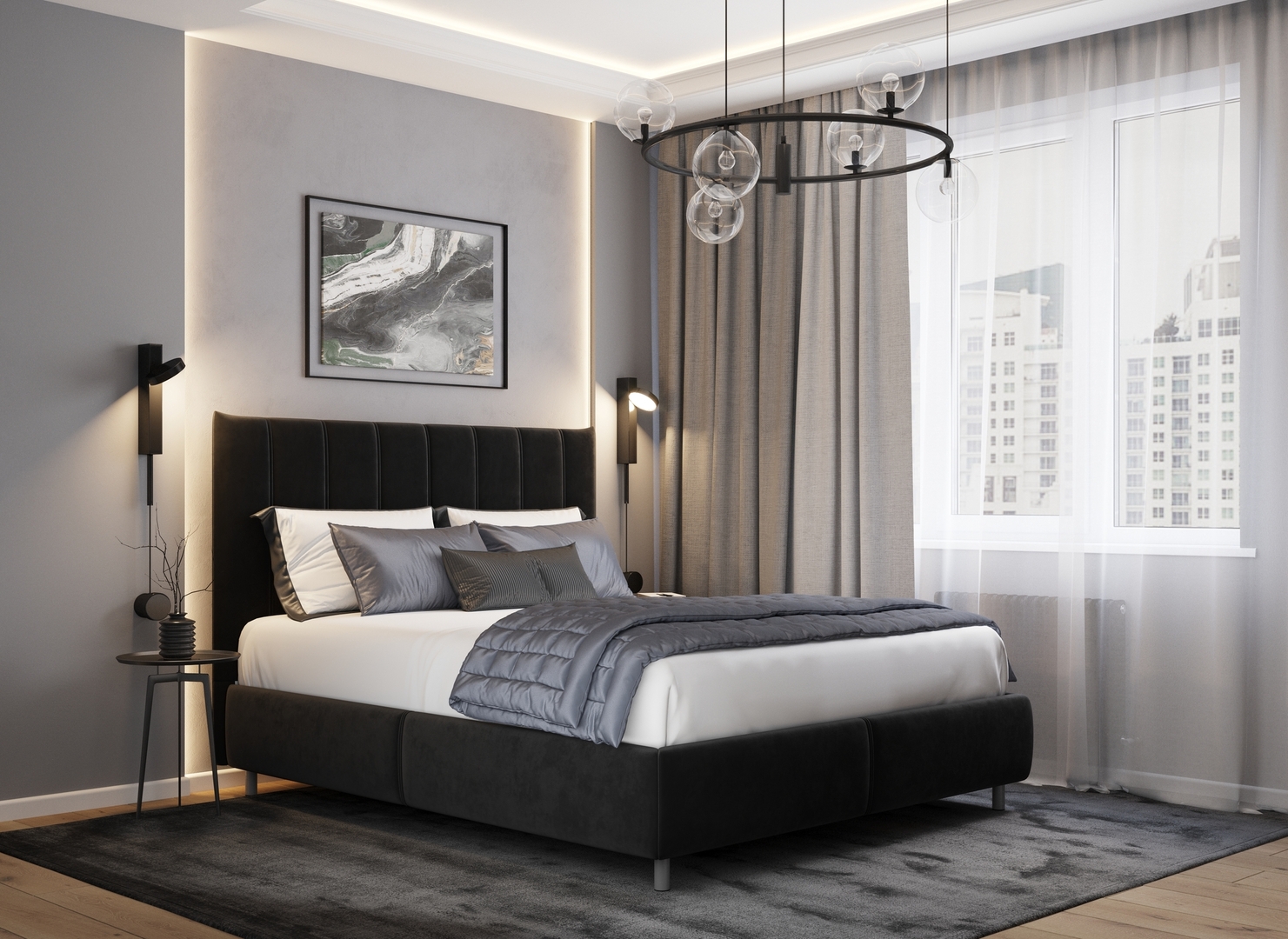 Обратная сторона изголовья выполнена в мебельной ткани и позволяет ставить кровать в центре комнаты для зонирования пространства.