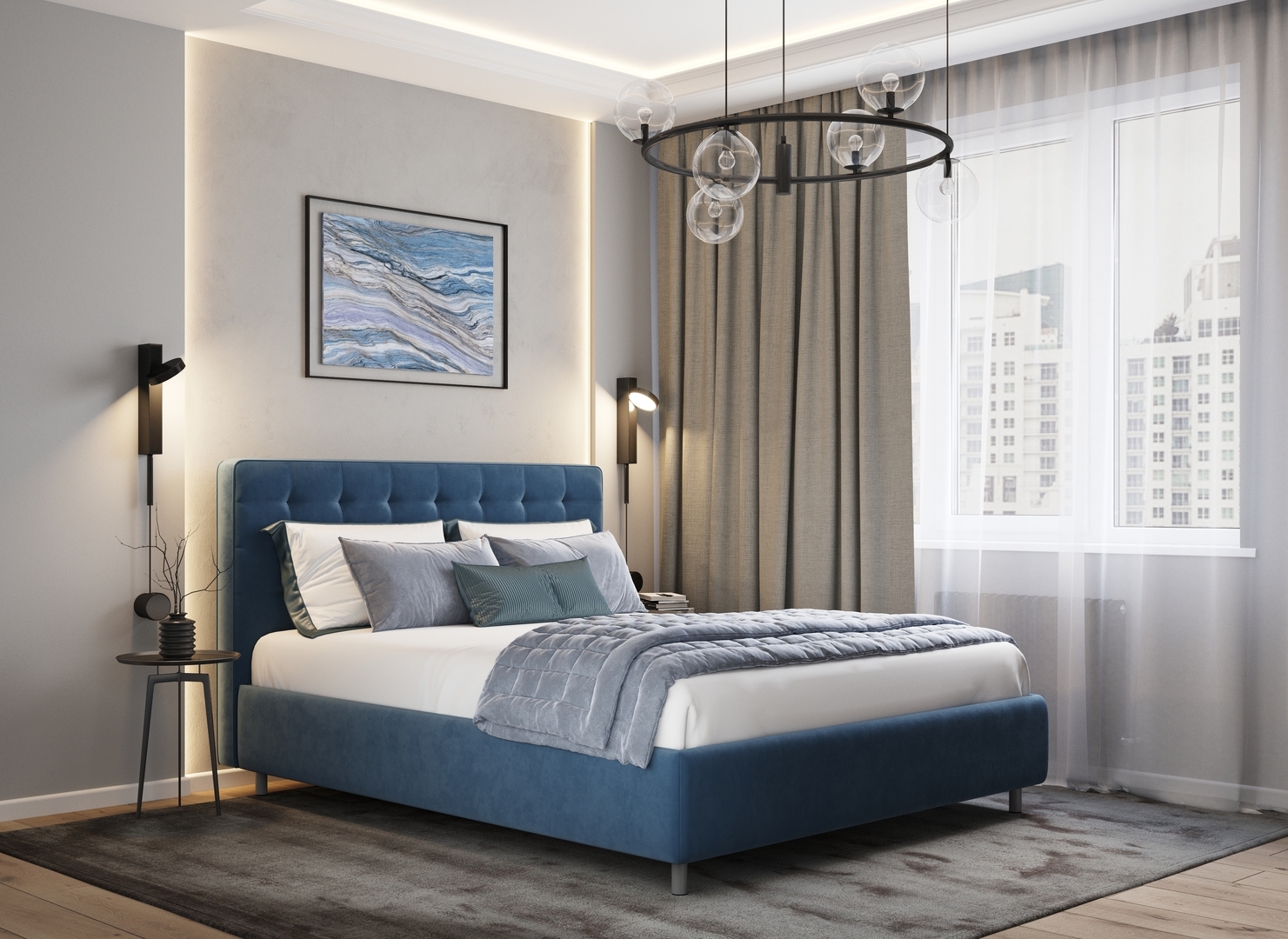 Оформите образ кровати, выбирая обивочный материал, который подчеркнет звучание Вашей спальни и отразит Ваш вкус. Обратите внимание на однотонный гладкий велюр, который усиливает объемную фактуру стежки.