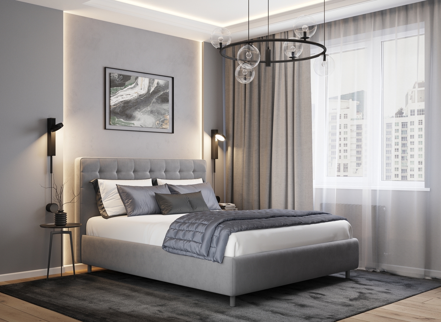Обратная сторона изголовья выполнена в мебельной ткани и позволяет ставить кровать в центре комнаты для зонирования пространства.